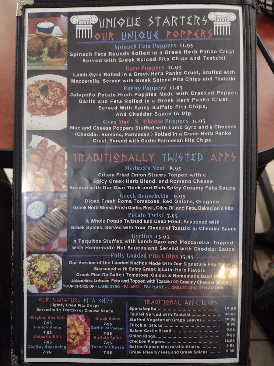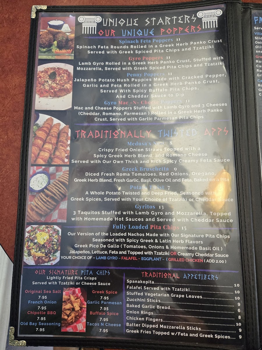 Mac and Cheese Poppers Stuffed with Lamb Gyro and 3 Cheeses (Cheddar, Romano, Parmesan ) Rolled in a Greek Herb Panko Crust, Served with Garlic Parmesan Pita Chips.