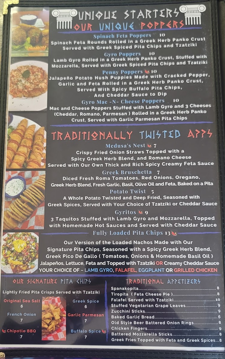 Gyro, mushrooms, onions and peppers, French fries, melted Mozzarella and Feta with hot spices on an open pita.